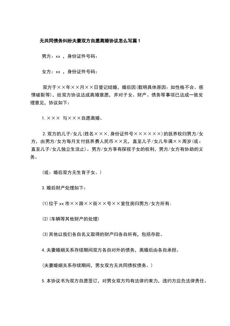 无共同债务纠纷夫妻双方自愿离婚协议怎么写篇11