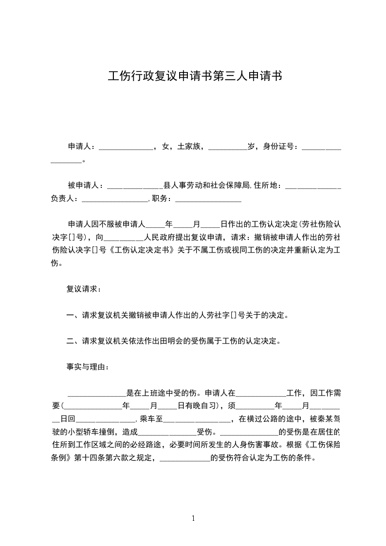 申请人因不服被申请人_____年_____月_____日作出的工伤认定决定(劳社伤险认决字[]号),向__________人民政府提出复议申请,请求:撤销被申请人作出的劳社伤险认决字[]号《工伤认定决定书》关于不属工伤或视同工伤的决定并重新认定为工伤。