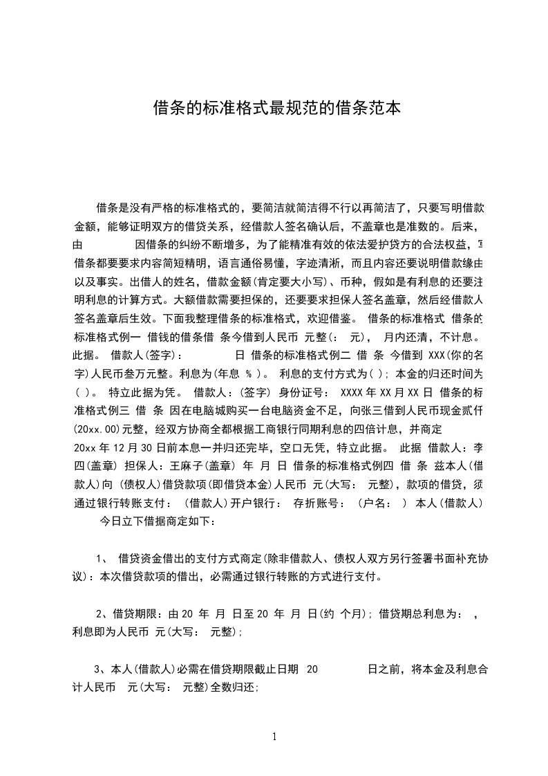 借条是没有严格的标准格式的,要简洁就简洁得不行以再简洁了,只要写明借款金额,能够证明双方的借贷关系,经借款人签名确认后,不盖章也是准数的。后来,由 因借条的纠纷不断增多,为了能精准有效的依法爱护贷方的合法权益,写借条都要要求内容简短精明,语言通俗易懂,字迹清淅,而且内容还要说明借款缘由以及事实。出借人的姓名,借款金额(肯定要大小写)、币种,假如是有利息的还要注明利息的计算方式。大额借款需要担保的,还要要求担保人签名盖章,然后经借款人签名盖章后生效。下面我整理借条的标准格式,欢迎借鉴。 借条的标准格式 借条的标准格式例一 借钱的借条借 条今借到人民币 元整(: 元), 月内还清,不计息。 此据。 借款人(签字): 日 借条的标准格式例二 借 条 今借到 XXX(你的名字)人民币叁万元整。利息为(年息 % )。 利息的支付方式为( ); 本金的归还时间为( )。 特立此据为凭。 借款人:(签字) 身份证号: XXXX年XX月XX日 借条的标准格式例三 借 条 因在电脑城购买一台电脑资金不足,向张三借到人民币现金贰仟(20xx.00)元整,经双方协商全都根据工商银行同期利息的四倍计息,并商定 20xx年12月30日前本息一并归还完毕,空口无凭,特立此据。 此据 借款人:李 四(盖章) 担保人:王麻子(盖章) 年 月 日 借条的标准格式例四 借 条 兹本人(借款人)向 (债权人)借贷款项(即借贷本金)人民币 元(大写: 元整),款项的借贷,须通过银行转账支付: (借款人)开户银行: 存折账号: (户名: ) 本人(借款人) 今日立下借据商定如下: