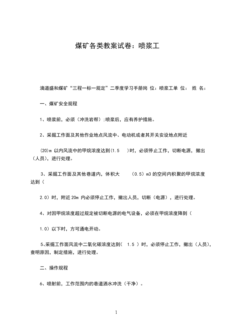 滴道盛和煤矿“三程一标一规定”二季度学习手册岗 位:喷浆工单 位: 姓 名: