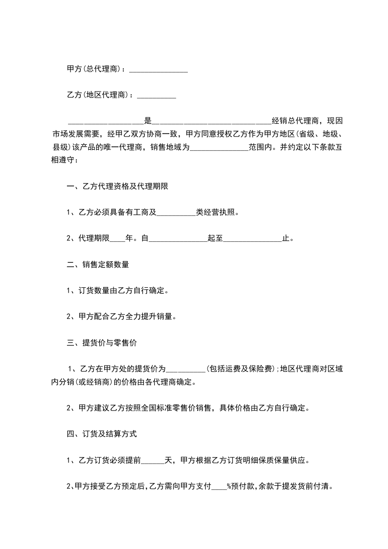 ___________________是______________________________经销总代理商,现因市场发展需要,经甲乙双方协商一致,甲方同意授权乙方作为甲方地区(省级、地级、县级)该产品的唯一代理商,销售地域为_______________范围内。并约定以下条款互相遵守: