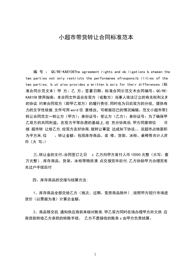 编号:QC/RE-KA8108The agreement rights and ob.ligations b.etween the two parties not only restricts the performanee ofresponsib.ilities of the two parties, b.ut also provides a written b.asis for their differences(标准合同示范文本)甲 方:乙 方:签署日期:标准合同示范文木合同编号:QC/RE-KA8108使用指南:本合同文件适合在双方(或数方)当事人依法订立的有关权利义务的协议.约束合同双方(即甲乙双方)的履行责任,同时也为日后双方的分歧,提供有力的文字性依据.文件可用word任 意修改,可根据目己的情况编辑。范文小超市带货转让合同范文一转让方(甲方):身份证号:受让方(乙方):身份证号:为了确保甲乙双方的共同利益,在双方平等自愿的基础上,经 充分协商后,甲方同意将位 许继 超市转 让给乙方,经双方友好协商,就转让事宜 达成如下协议。、该超市占地面积为平方米,位 、转让金额:包括库存商品、装 修、货架、冰柜、桌椅等共计人民币(大 写:)