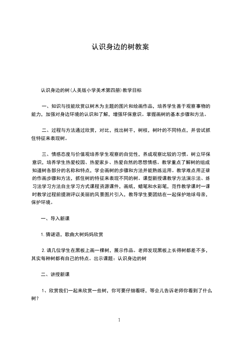 一、知识与技能欣赏以树木为主题的图片和绘画作品,培养学生善于观察事物的能力,加强对身边环境的认识和了解,增强环保意识。掌握画树的基本步骤和方法。