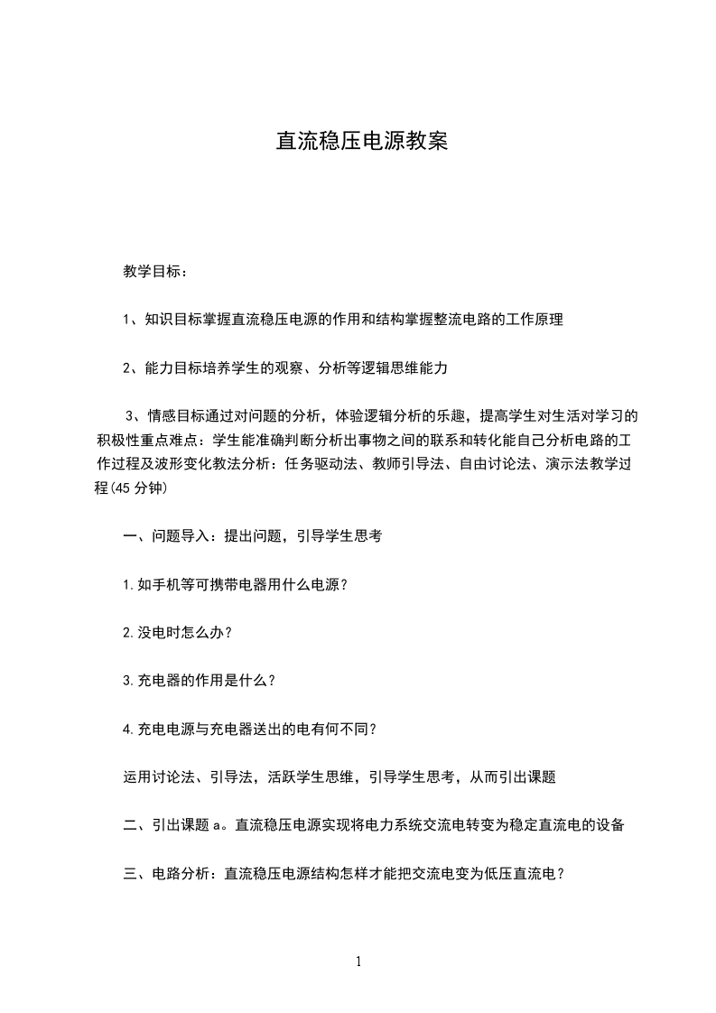 二、引出课题a。直流稳压电源实现将电力系统交流电转变为稳定直流电的设备
