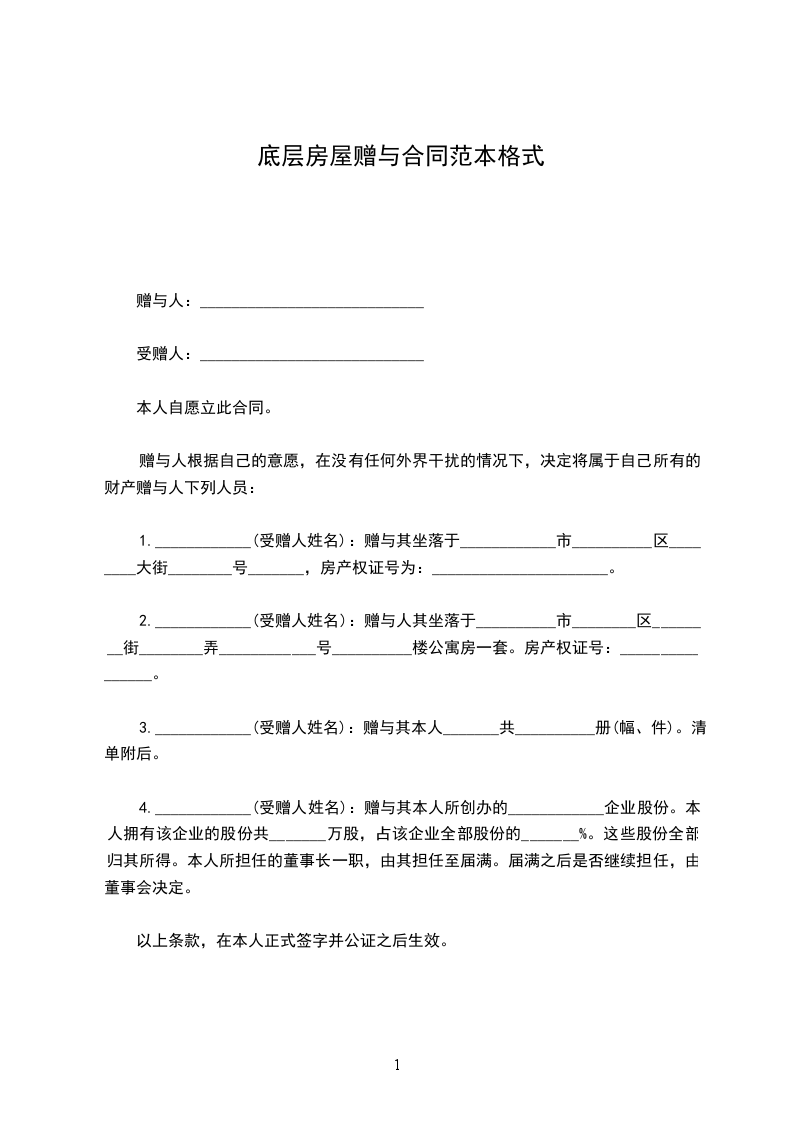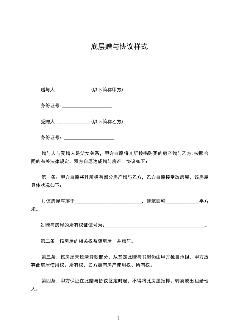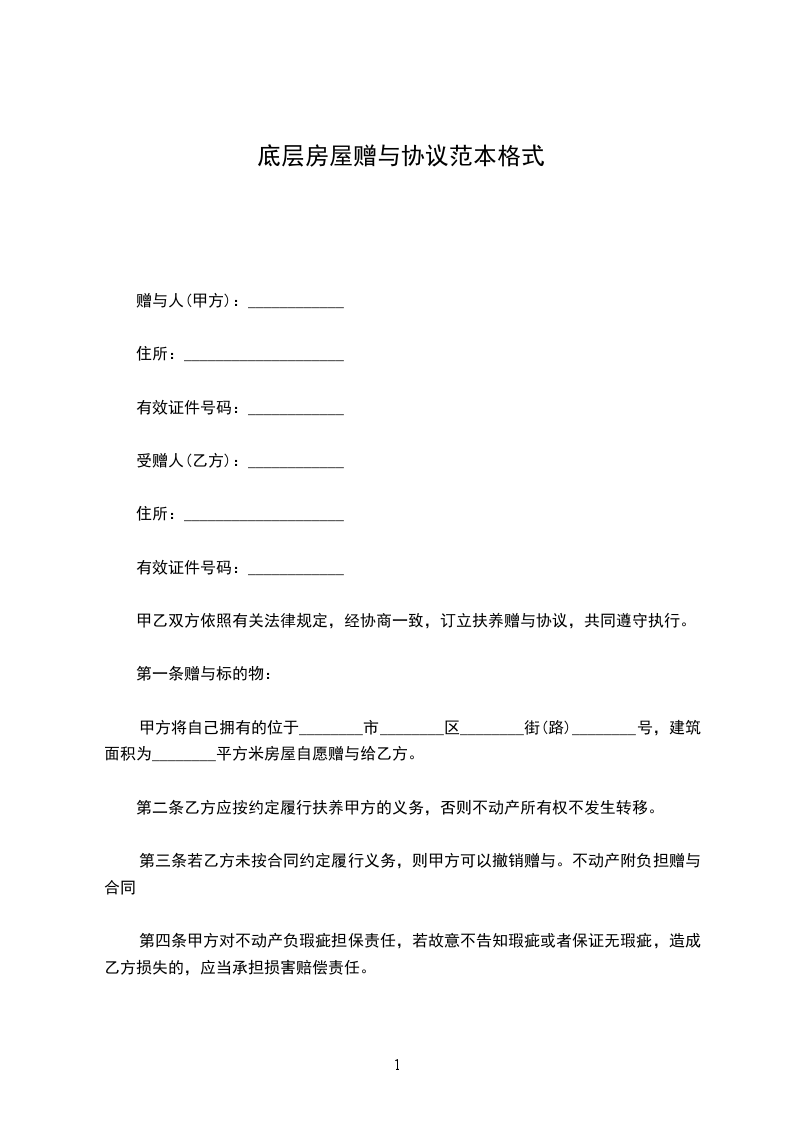 甲方决定将位于___________________________________的房屋一套,建筑面积_________平方米无偿赠与给乙方;乙方同意接受此赠与。