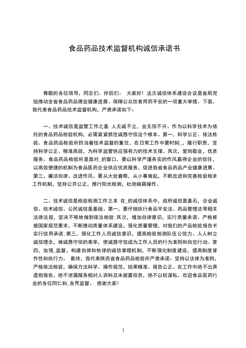 尊敬的各位领导,同志们、伴侣们: 大家好! 这次诚信体系建设会议是省局党组推动全省食品药品德业健康进展、保障公众饮食用药平安的一项重大举措。下面,我代表食品药品技术监督机构,严肃承诺如下:
