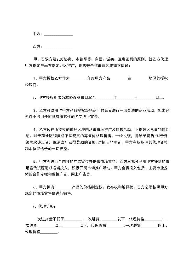_____________________是____________________________中国地区________________经销总代理商,现因市场发展需要,经甲乙双方协商一致,甲方同意授权乙方作为甲方____________地区(省级、地级、县级)该产品的唯一代理商,销售地域为____________范围内。并约定以下条款互相遵守: