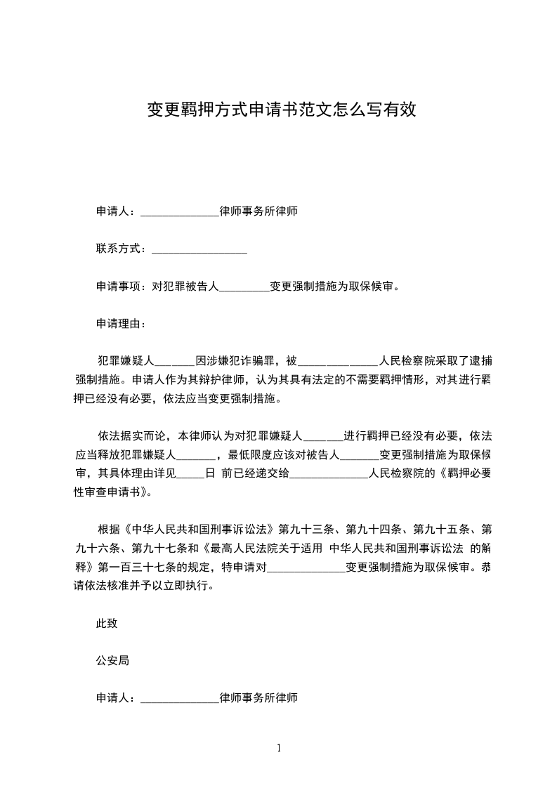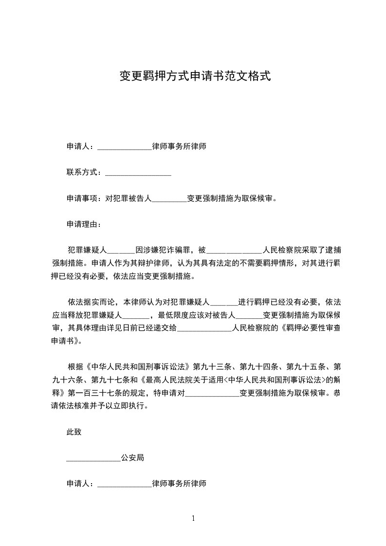 根据《中华人民共和国刑事诉讼法》第九十三条、第九十四条、第九十五条、第九十六条、第九十七条和《最高人民法院关于适用的解释》第一百三十七条的规定,特申请对______________变更强制措施为取保候审。恭请依法核准并予以立即执行。