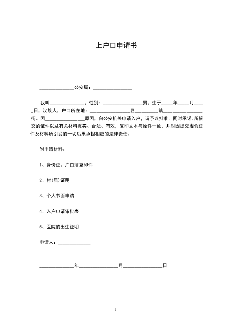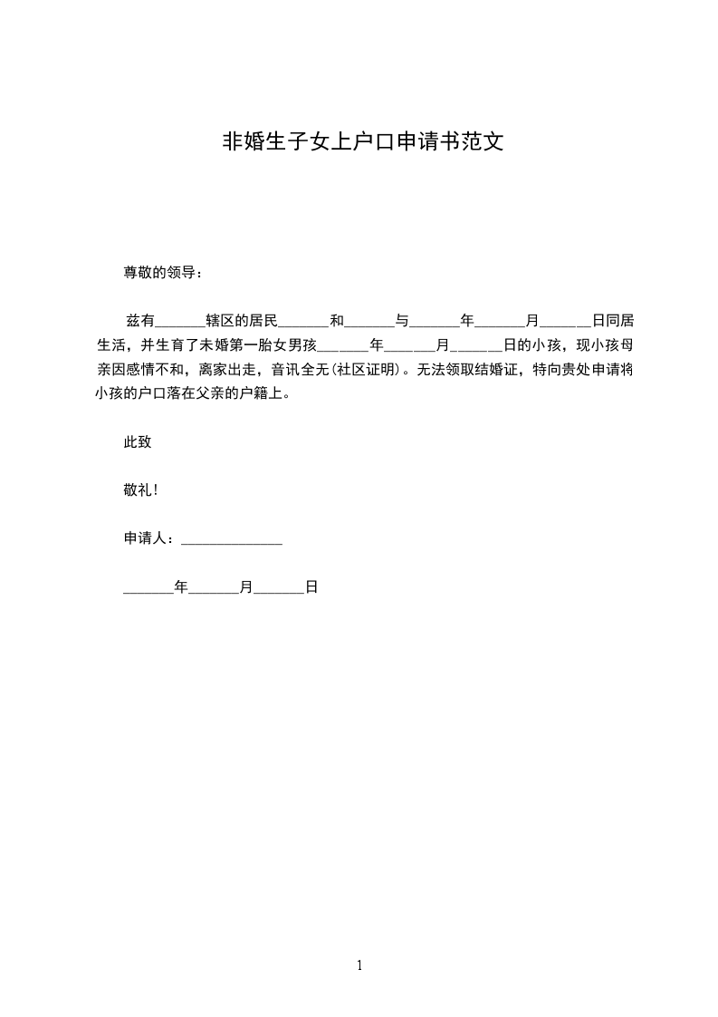 兹有_______辖区的居民_______和_______与_______年_______月_______日同居生活,并生育了未婚第一胎女男孩_______年_______月_______日的小孩,现小孩母亲因感情不和,离家出走,音讯全无(社区证明)。无法领取结婚证,特向贵处申请将小孩的户口落在父亲的户籍上。