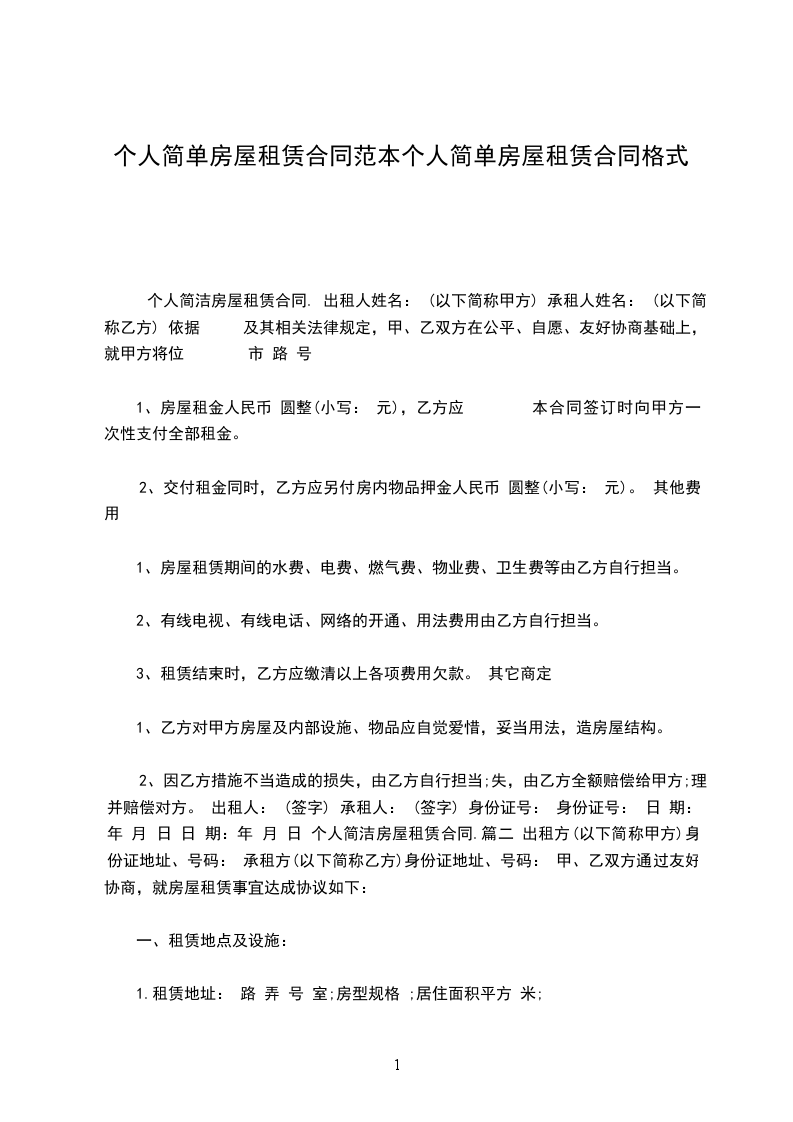 个人简洁房屋租赁合同. 出租人姓名: (以下简称甲方) 承租人姓名: (以下简称乙方) 依据 及其相关法律规定,甲、乙双方在公平、自愿、友好协商基础上,就甲方将位 市 路 号