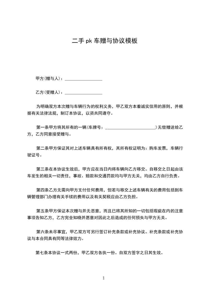 第一条甲方将其所有的一辆(车牌号:________________________)无偿赠送给乙方,乙方同意接受赠与。