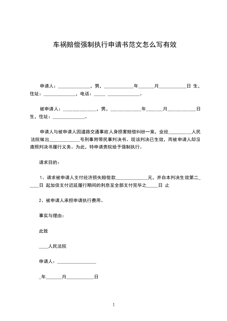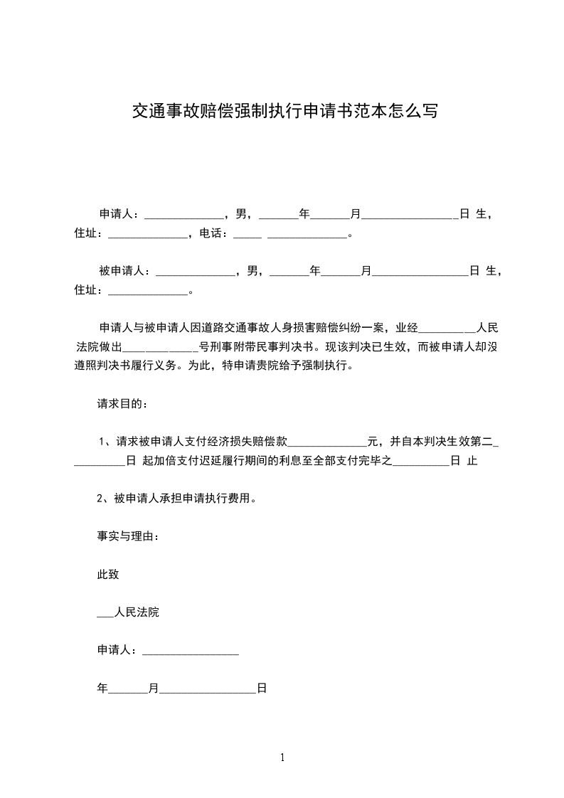 申请人与被申请人因道路交通事故人身损害赔偿纠纷一案,业经__________人民法院做出_____________号刑事附带民事判决书。现该判决已生效,而被申请人却没遵照判决书履行义务。为此,特申请贵院给予强制执行。
