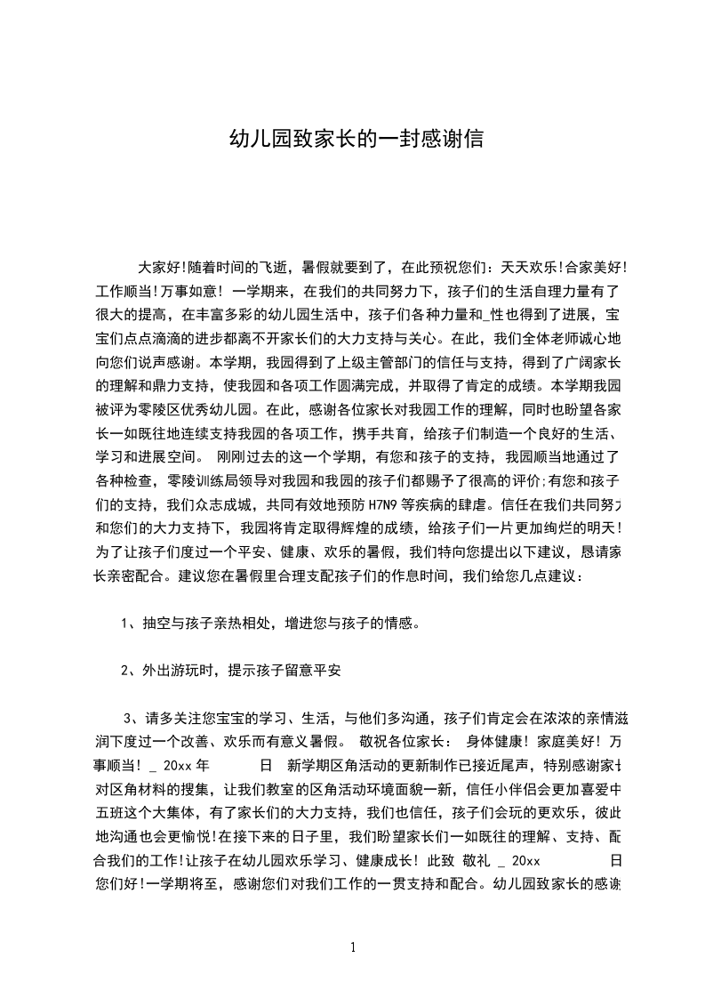 3、请多关注您宝宝的学习、生活,与他们多沟通,孩子们肯定会在浓浓的亲情滋润下度过一个改善、欢乐而有意义暑假。 敬祝各位家长: 身体健康! 家庭美好! 万事顺当! _ 20xx年 日 新学期区角活动的更新制作已接近尾声,特别感谢家长对区角材料的搜集,让我们教室的区角活动环境面貌一新,信任小伴侣会更加喜爱中五班这个大集体,有了家长们的大力支持,我们也信任,孩子们会玩的更欢乐,彼此地沟通也会更愉悦!在接下来的日子里,我们盼望家长们一如既往的理解、支持、配合我们的工作!让孩子在幼儿园欢乐学习、健康成长! 此致 敬礼 _ 20xx 日 您们好!一学期将至,感谢您们对我们工作的一贯支持和配合。幼儿园致家长的感谢信幼儿园致家长的感谢信。一学期以来,孩子的成长和进步离不开您们的辛勤付出,您们主动地参加及配合成为了我们工作的最大动力。在此格外感谢精灵班的家委会成员,给我们的活动出谋划策,不辞辛苦的组织多次亲子活动,让我们的孩子和家长有了更进一步的交往,增加分散力之余供应了很好的互动平台;感谢阮景婷妈妈为我们进行班级群网的管理工作以及通讯录的整理和编辑。感谢本学期为孩子进行助教的家长们以及主动参与助教的其他家长,您们精彩的活动必定让我们的孩子收获不少。感谢! 您们的支持,我们牢记 心,你们的配合,我们为之动容,我们将会一如既往的做好工作与您携手并肩,为孩子的成长共同努力! 此致! 敬礼! _ 20xx年 日
