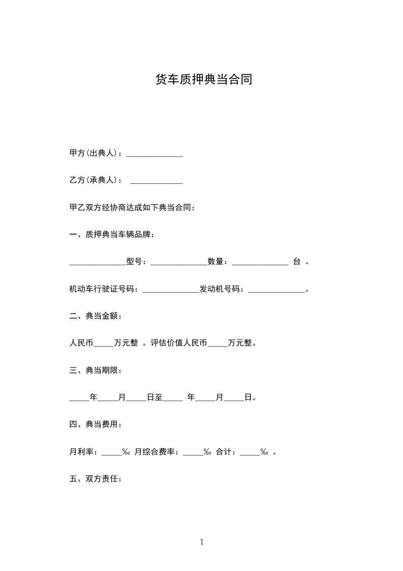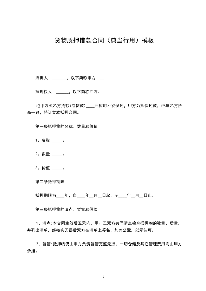 1.1乙方自愿将自有的________(以下简称“货物”),规格________数量________(该数量由双方点库确认)帐面价格________质押典当给甲方。甲方同意接受乙方以上述货物为本合同项下债权之担保。