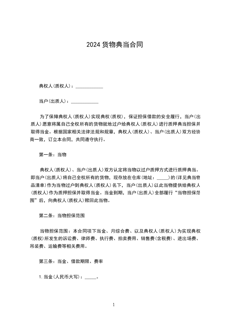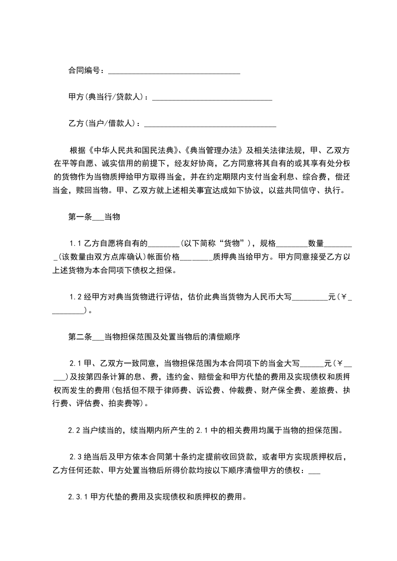 根据《中华人民共和国民法典》、《典当管理办法》及相关法律法规,甲、乙双方在平等自愿、诚实信用的前提下,经友好协商,乙方同意将其自有的或其享有处分权的货物作为当物质押给甲方取得当金,并在约定期限内支付当金利息、综合费,偿还当金,赎回当物。甲、乙双方就上述相关事宜达成如下协议,以兹共同信守、执行。