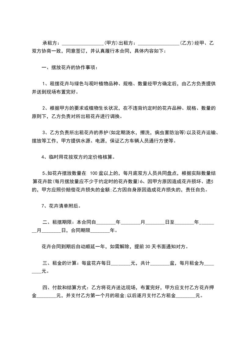 乙方将花卉送达现场,布置完好,甲方应支付乙方花卉押金元,并支付乙方第一个月的租金;以后逐月支付乙方租金元。