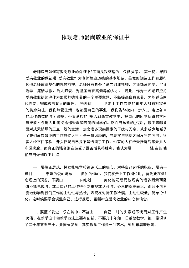老师应当如何写爱岗敬业的保证书?下面是我整理的,仅供参考。 第一篇:老师爱岗敬业的保证书 爱岗敬业作为老师职业道德的基本规范,是做好训练工作和履行其他老师道德规范的思想前提,老师只有具备了爱岗敬业精神,才能热爱同学、严谨治学、廉洁从教、为人师表、为祖国培育高素养的人才。 因此,作为一名老师应把爱岗敬业铸师魂作为加强师德修养的一个重要主题,不断提高自身素养,才能适应时代需要,完成教书育人的重任。 格外对 刚走上工作岗位的青年人都有对将来的美妙向往,我们热爱生活,也热爱自己的事业。我们告辞校内,步入_,走上各自的工作岗位的时间很短,带着满腔的_投入到课堂教学中,把自己的所学所得的学问与技能不余遗力地传授给那些求知若渴的同学们。然而当短暂的_过后,接下来却要面对成天枯燥的三点一线的生活,加之诸多现实因素的干扰与无奈,或多或少地减弱了我们爱岗敬业的工作热忱人生不是一帆风顺的,当现实与抱负之间发生冲突时,很多人经不住考验,开头怀疑自己是不是选错了工作,也有的人在经受挫折后怨天尤人、牢骚满腹。而真正的强者则在经受了困苦后获得胜利。我认为属 强者的我们应当做到以下几点: