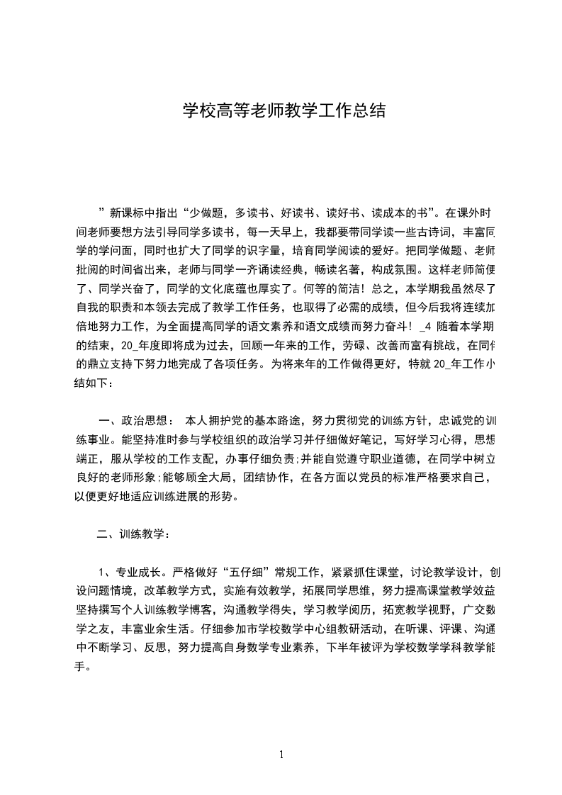 二、在训练教学上,敬业爱岗,严谨治教。 把同学教好,让同学胜利,是每位老师的心愿、的荣誉。作为一名数学老师,让同学把握良好的学习方法,猎取更多的学问是最重要的任务。所以,我在课堂教学中,坚持做到仔细钻研大纲,认真分析教材的编写意图,仔细备课,留意设计好每堂课的教学方法,讨论现代训练技术在课堂教学中的应用,注重对同学各种本领的培育。在仔细做好日常教学工作的同时,努力探究在学校数学课堂教学中落实素养训练的方法及手段,探究在训练中培育同学本领进展的途径。在工作中,我深知学习的重要性,抓住一切机会仔细学习,在不断学习、不断实践中不断提高自我的训练教学水平及教学管理水平。我抓住学校支配外出听课的机会,虚心学习,不耻下问,准时消化,吸取别人的精华,在自我的教学中为断实践,不断总结,不断提高。平常向书本学习、向身边有阅历的老师学习,提高自我的课堂教学水平,努力构成自我的课堂教学风格。在训练教学工作中,我在做到教学“五仔细”的同时,平常能以“团结、协作”的精神和老师们共同沟通、相互学习、共同提高。 我兢兢业业,尽职尽责。多年来,时时以“爱心、耐烦、细心”贯穿始终,去关怀每一位同学,去搞好班级的每一次活动。这个学期,我班取得了较好的成绩,我决心让他们在一种“宽松、探求、竞争”的氛围健壮成长。本学年担当_(_)班数学老师,依据学校德少工作方案,仔细开展各项活动,加强行为习惯训练及良好心理品质的培育。关怀同学的学习和生活,特别关注后进生,予以他们更多的关怀,鼓起他们学习的劲头,更好地融入在这个班级体中。注重行为规范训练,从实抓起,用正确的舆论导向,用榜样的力气,促使同学从被动到主动,从他律到自觉,养成良好的心理品质和行为习惯。经过晨会、班会、黑板报、墙报等渠道,使同学自觉地成为团体的仆人,学习的仆人。加强“平安训练”,使“平安”牢牢地刻在同学心中。使班级蒸蒸日上,尤其注重与家长的联系,运用电话、家访、请家长到学校等多种途径和方法,把同学在校的表现及改变,如期向家长汇报,让家长了解孩子在校是提高了还是退步了,准时把握孩子各方面的优点和不足,以便有针对性地帮助老师开展训练活动。由 我的主动,有些家长也很情愿将孩子在家的表现反馈过来,期望老师的帮忙。这样的双向活动,使家长也参加对同学的管理,对同学的健康成长起到了良好的督促作用。 一学年来,我从班级的分散到干部的培育,从黑板报的出刊到广播稿的选择,从教室布置到班级竞赛,不知要化多少心血、牺牲多少个休息日,但我没有怨言过,总是一如既住地去完成一件件事情,做好一项项工作。总之,在这一学年中,我不仅仅在业务本领上,还是在训练教学上都有了必需的提高。但我平常工作中消失需改善的地方也较多,如理论学问不够,论文精品意识不强;电脑学问进步不快。在今后的工作中,我将扬长补短,不断努力。 _