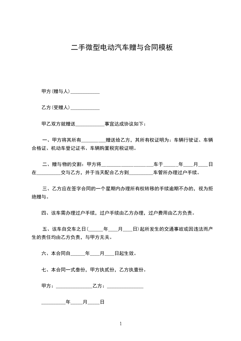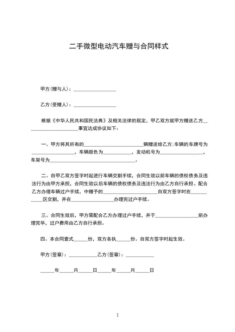 第一条、甲方将其所有的一辆_______________(车牌号:____________________)无偿赠送给乙方,乙方同意接受赠与。