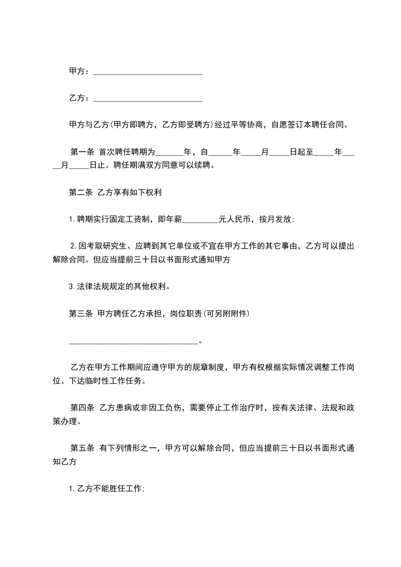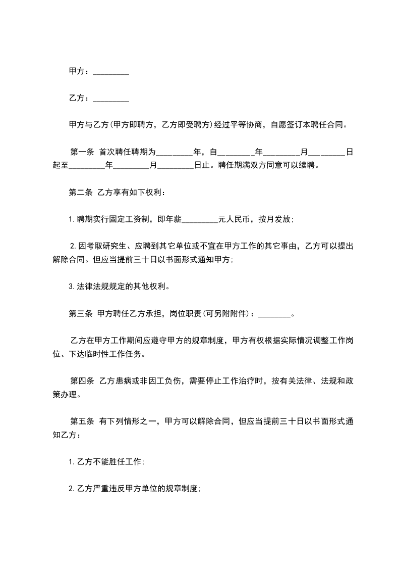 第一条 首次聘任聘期为_年,自_年_月_日起至_年_月_日止。聘任期满双方同意可以续聘。 其次条 乙方享有如下权利: