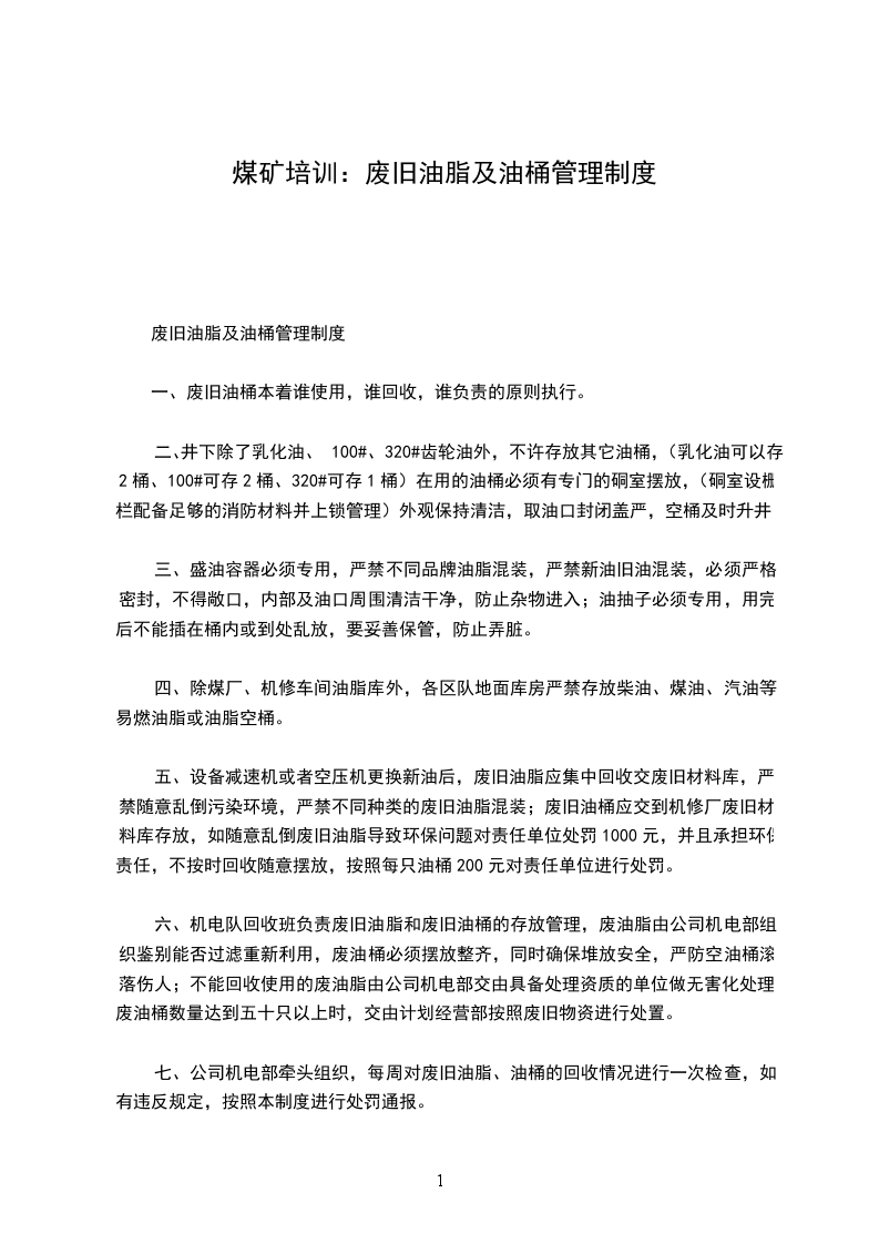 六、机电队回收班负责废旧油脂和废旧油桶的存放管理,废油脂由公司机电部组织鉴别能否过滤重新利用,废油桶必须摆放整齐,同时确保堆放安全,严防空油桶滚落伤人;不能回收使用的废油脂由公司机电部交由具备处理资质的单位做无害化处理,废油桶数量达到五十只以上时,交由计划经营部按照废旧物资进行处置。