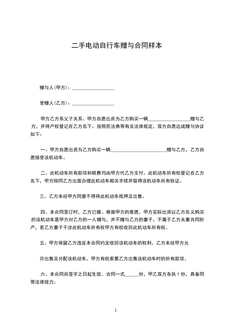 一、甲方自愿出资为乙方购买一辆________________________赠与乙方,乙方自愿接受该机动车。