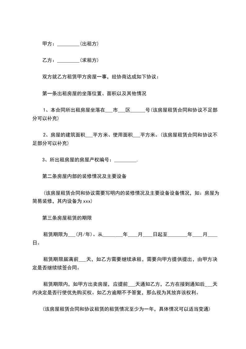 2、房屋的建筑面积___平方米、使用面积___平方米。(该房屋租赁合同和协议不足部分可以补充)