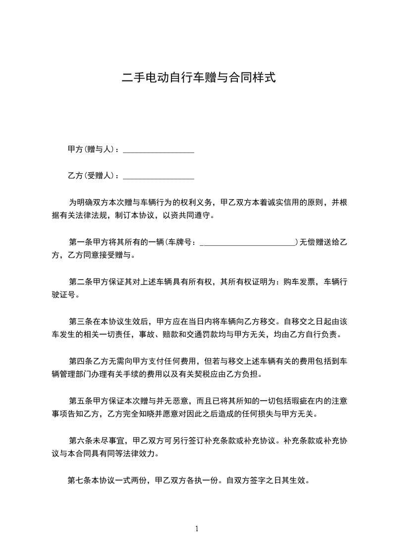 第一条甲方将其所有的一辆(车牌号:________________________)无偿赠送给乙方,乙方同意接受赠与。