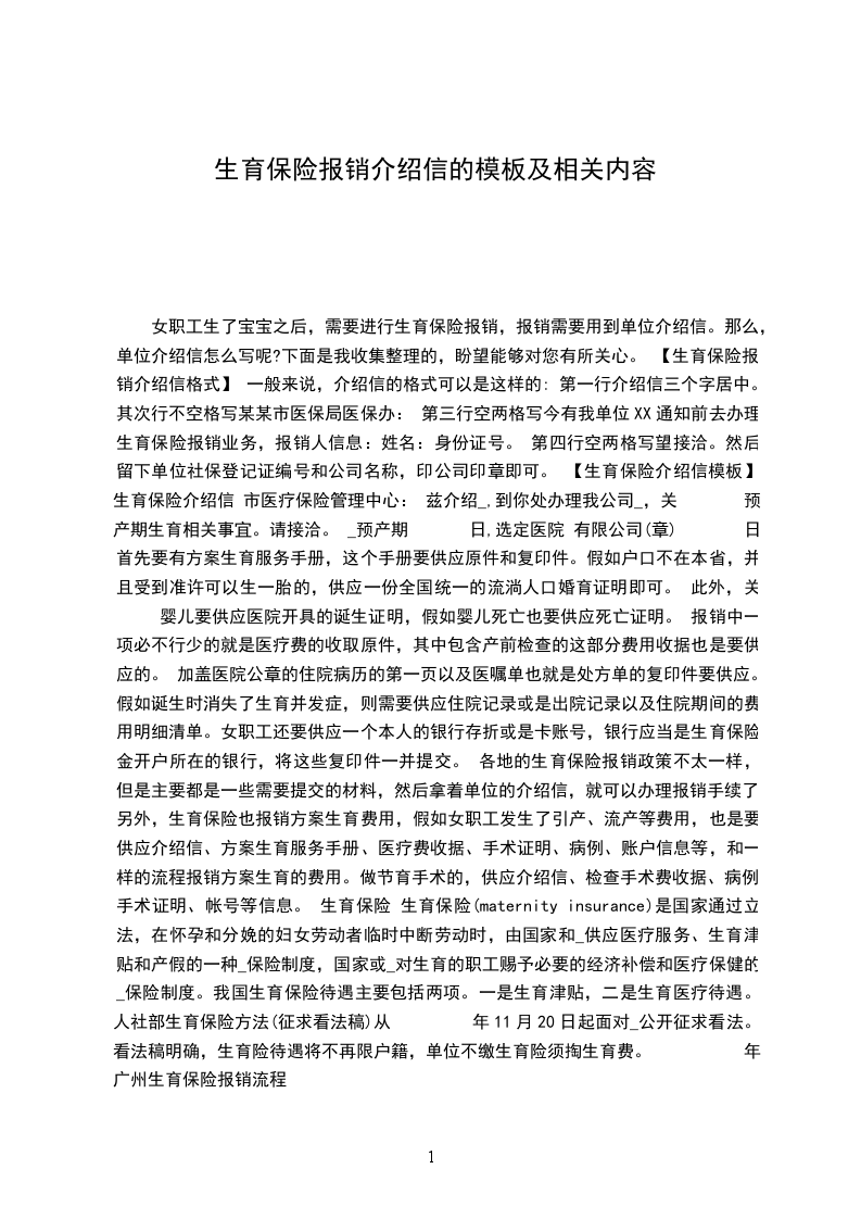 女职工生了宝宝之后,需要进行生育保险报销,报销需要用到单位介绍信。那么,单位介绍信怎么写呢?下面是我收集整理的,盼望能够对您有所关心。 【生育保险报销介绍信格式】 一般来说,介绍信的格式可以是这样的: 第一行介绍信三个字居中。 其次行不空格写某某市医保局医保办: 第三行空两格写今有我单位XX通知前去办理生育保险报销业务,报销人信息:姓名:身份证号。 第四行空两格写望接洽。然后留下单位社保登记证编号和公司名称,印公司印章即可。 【生育保险介绍信模板】 生育保险介绍信 市医疗保险管理中心: 兹介绍_,到你处办理我公司_,关 预产期生育相关事宜。请接洽。 _预产期 日,选定医院 有限公司(章) 日 首先要有方案生育服务手册,这个手册要供应原件和复印件。假如户口不在本省,并且受到准许可以生一胎的,供应一份全国统一的流淌人口婚育证明即可。 此外,关 婴儿要供应医院开具的诞生证明,假如婴儿死亡也要供应死亡证明。 报销中一项必不行少的就是医疗费的收取原件,其中包含产前检查的这部分费用收据也是要供应的。 加盖医院公章的住院病历的第一页以及医嘱单也就是处方单的复印件要供应。假如诞生时消失了生育并发症,则需要供应住院记录或是出院记录以及住院期间的费用明细清单。女职工还要供应一个本人的银行存折或是卡账号,银行应当是生育保险金开户所在的银行,将这些复印件一并提交。 各地的生育保险报销政策不太一样,但是主要都是一些需要提交的材料,然后拿着单位的介绍信,就可以办理报销手续了。 另外,生育保险也报销方案生育费用,假如女职工发生了引产、流产等费用,也是要供应介绍信、方案生育服务手册、医疗费收据、手术证明、病例、账户信息等,和一样的流程报销方案生育的费用。做节育手术的,供应介绍信、检查手术费收据、病例、手术证明、帐号等信息。 生育保险 生育保险(maternity insurance)是国家通过立法,在怀孕和分娩的妇女劳动者临时中断劳动时,由国家和_供应医疗服务、生育津贴和产假的一种_保险制度,国家或_对生育的职工赐予必要的经济补偿和医疗保健的_保险制度。我国生育保险待遇主要包括两项。一是生育津贴,二是生育医疗待遇。人社部生育保险方法(征求看法稿)从 年11月20日起面对_公开征求看法。看法稿明确,生育险待遇将不再限户籍,单位不缴生育险须掏生育费。 年广州生育保险报销流程