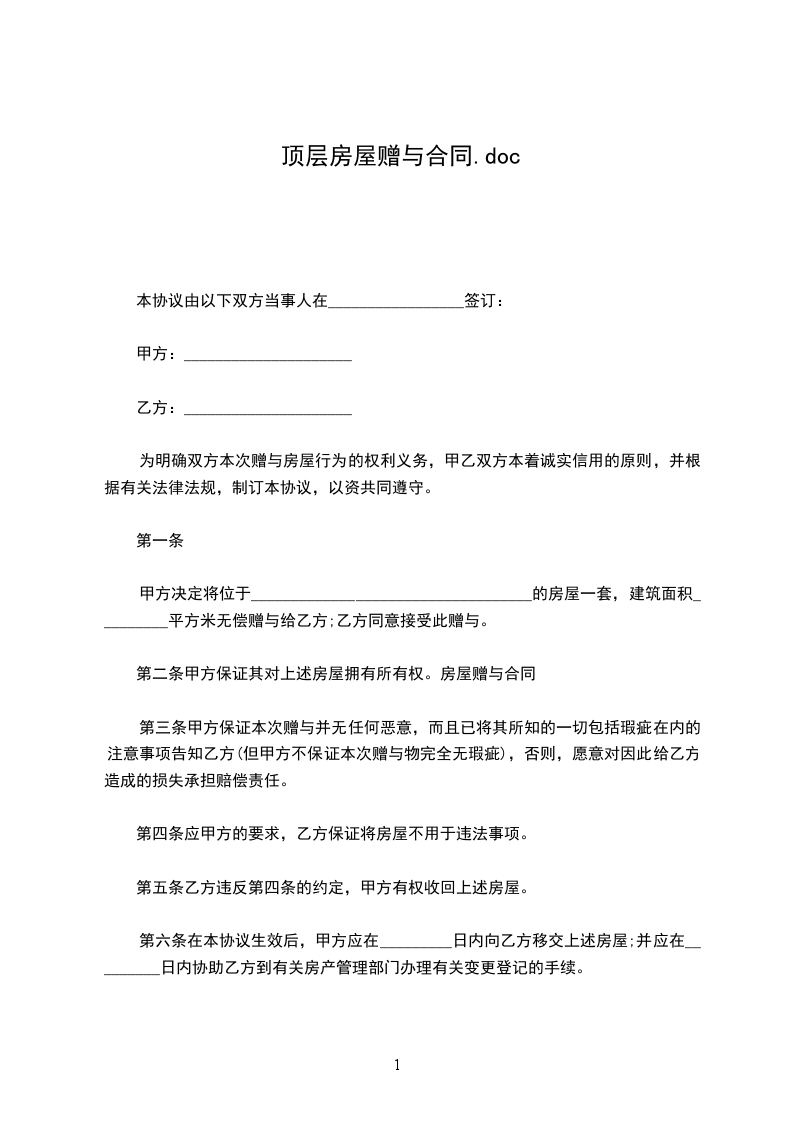 甲方决定将位于___________________________________的房屋一套,建筑面积_________平方米无偿赠与给乙方;乙方同意接受此赠与。
