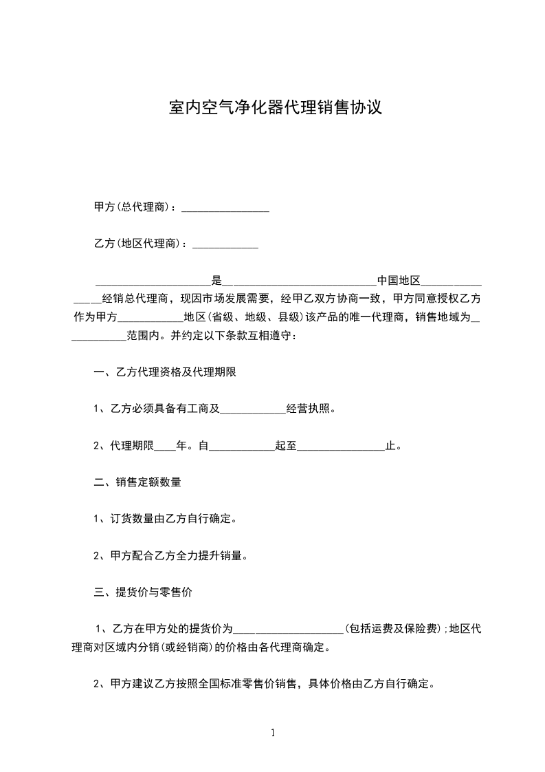 _____________________是____________________________中国地区________________经销总代理商,现因市场发展需要,经甲乙双方协商一致,甲方同意授权乙方作为甲方____________地区(省级、地级、县级)该产品的唯一代理商,销售地域为____________范围内。并约定以下条款互相遵守: