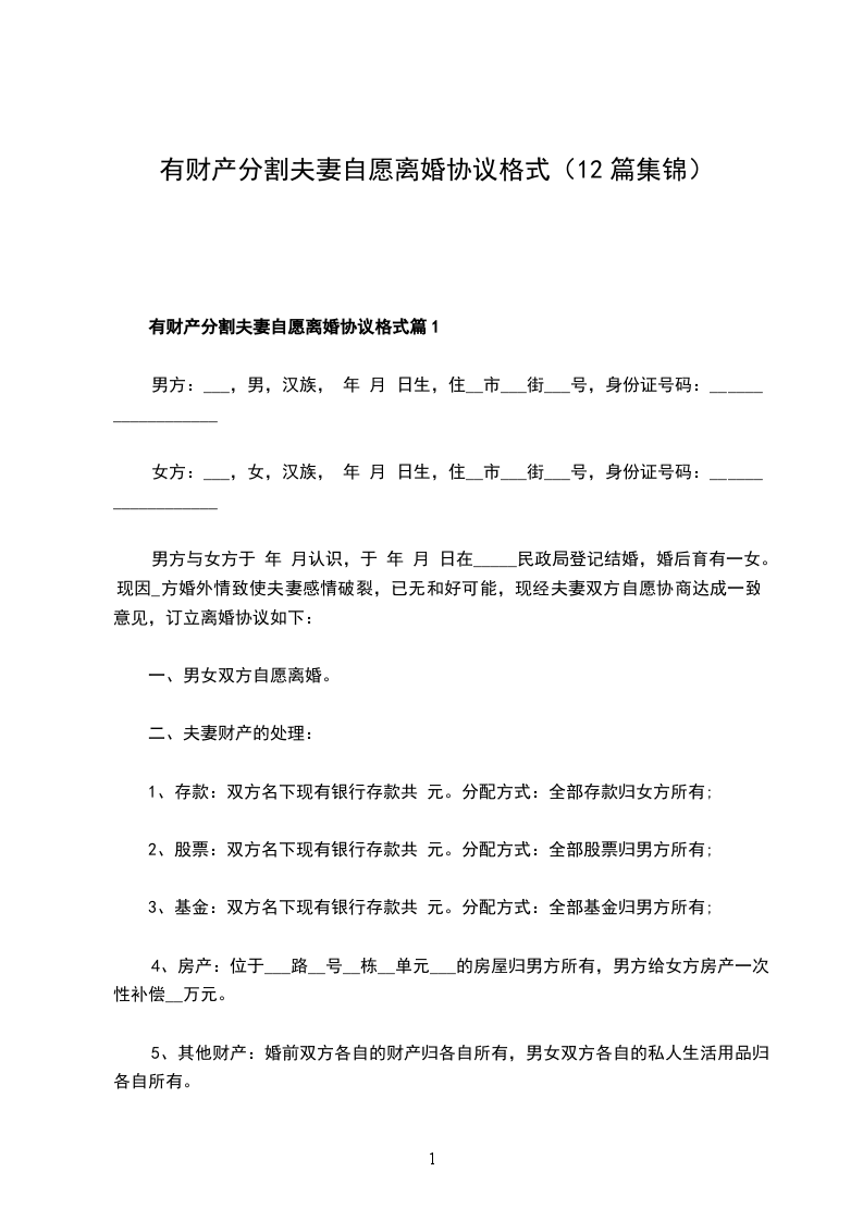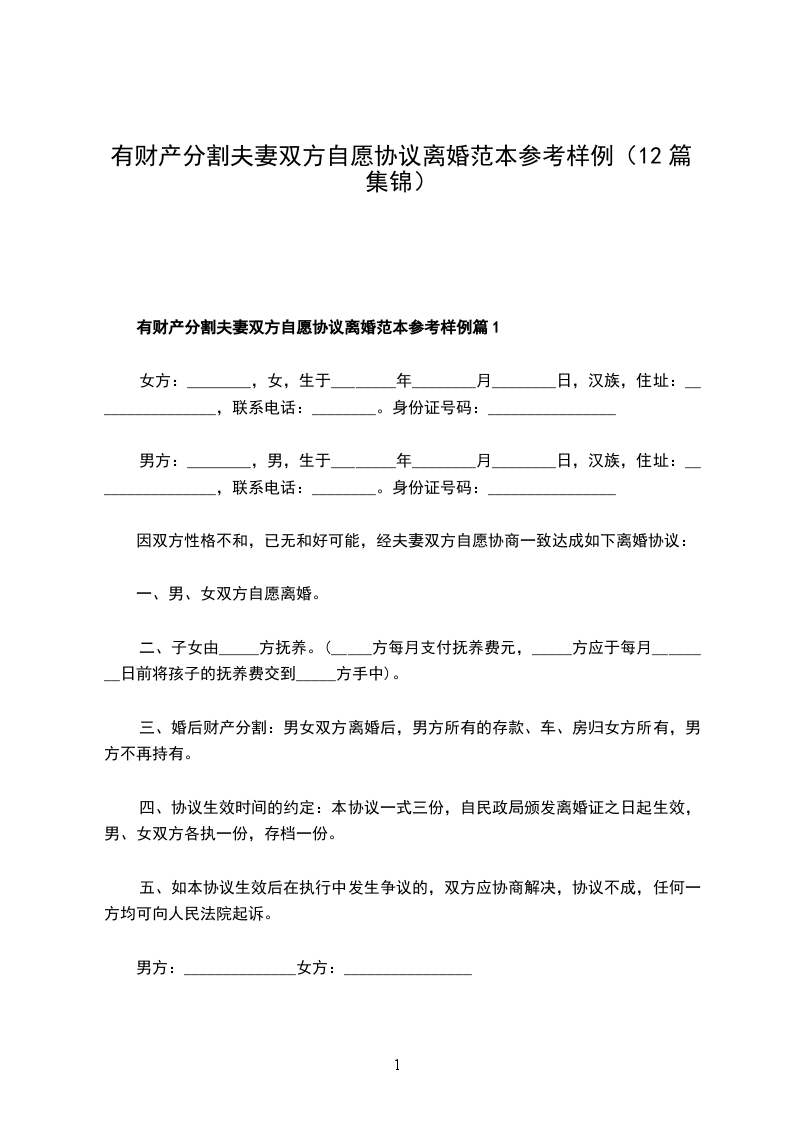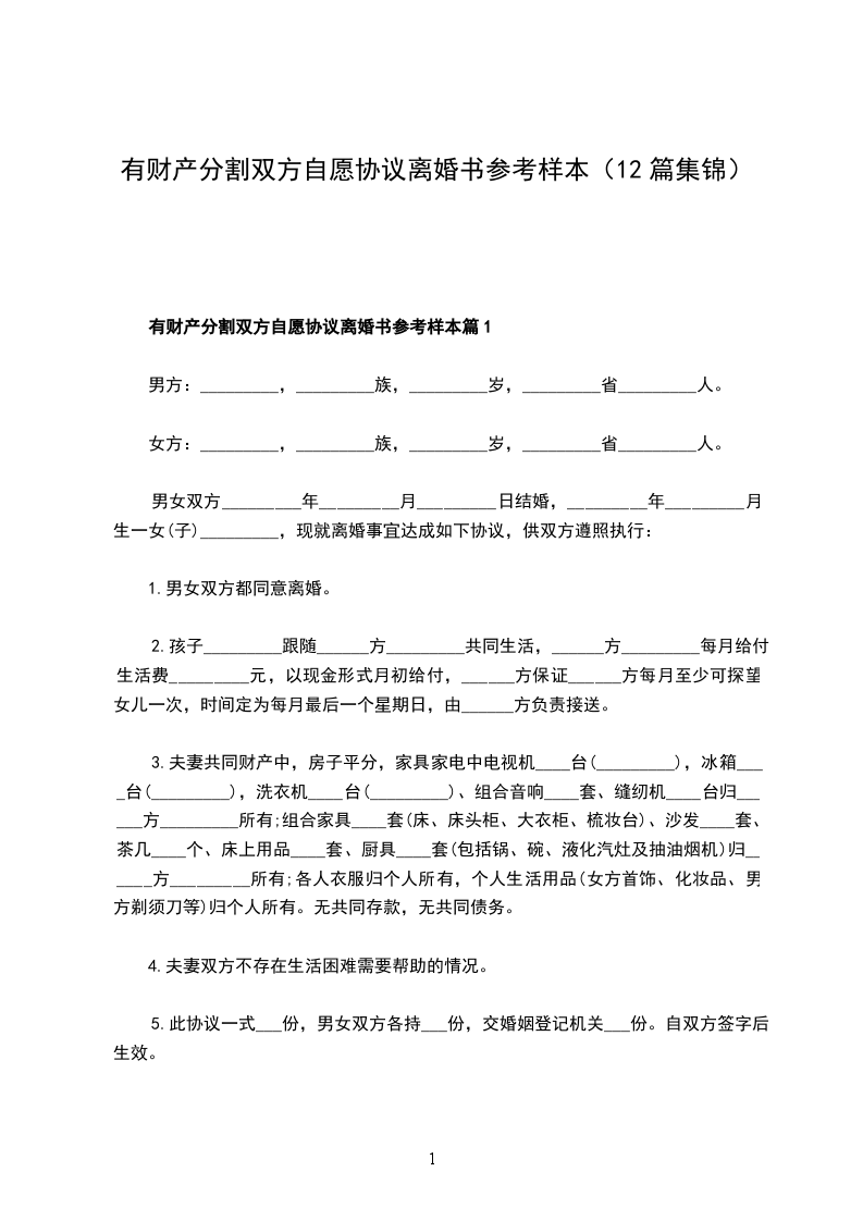 有财产分割双方自愿协议离婚书参考样本篇12