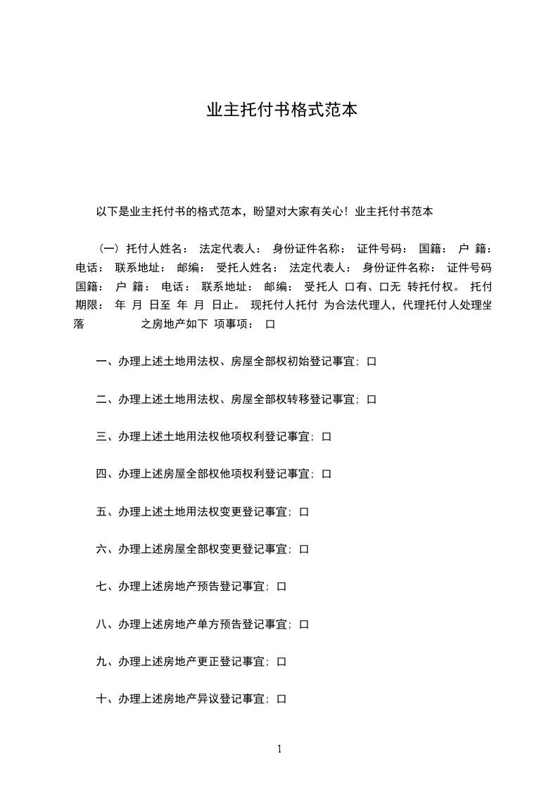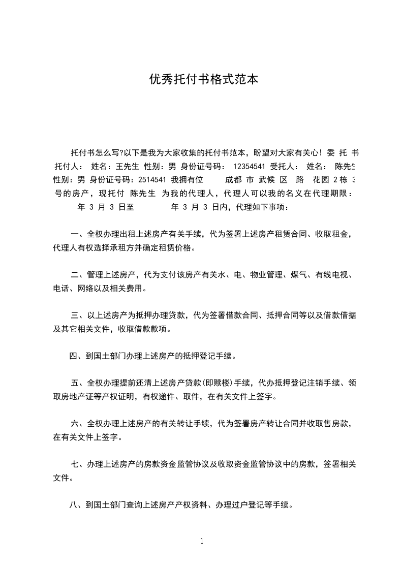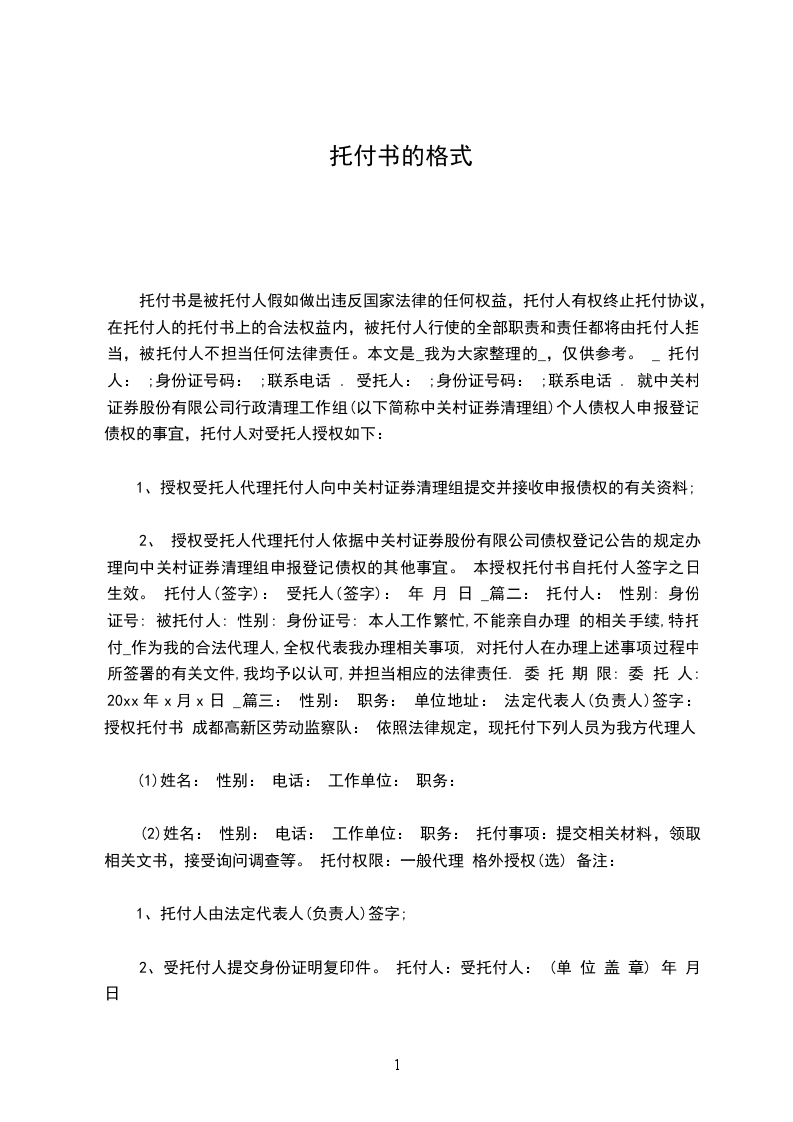 2、 授权受托人代理托付人依据中关村证券股份有限公司债权登记公告的规定办理向中关村证券清理组申报登记债权的其他事宜。 本授权托付书自托付人签字之日生效。 托付人(签字): 受托人(签字): 年 月 日 _篇二: 托付人: 性别: 身份证号: 被托付人: 性别: 身份证号: 本人工作繁忙,不能亲自办理 的相关手续,特托付_作为我的合法代理人,全权代表我办理相关事项, 对托付人在办理上述事项过程中所签署的有关文件,我均予以认可,并担当相应的法律责任. 委 托 期 限: 委 托 人: 20xx年x月x日 _篇三: 性别: 职务: 单位地址: 法定代表人(负责人)签字: 授权托付书 成都高新区劳动监察队: 依照法律规定,现托付下列人员为我方代理人: