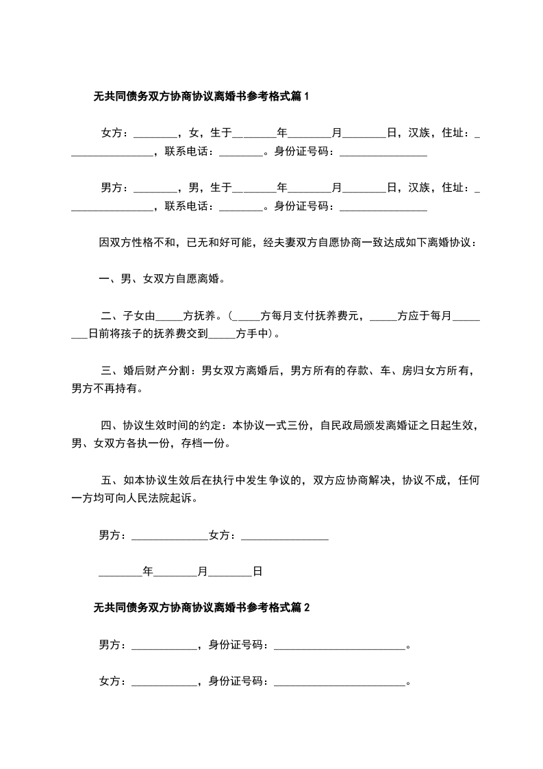 双方确认在婚姻关系存续期间没有发生任何共同债务,任何一方如对外负有债务的,由负债方自行承担。(_____方于_____年____月____日向xx所借债务由____方自行承担。)