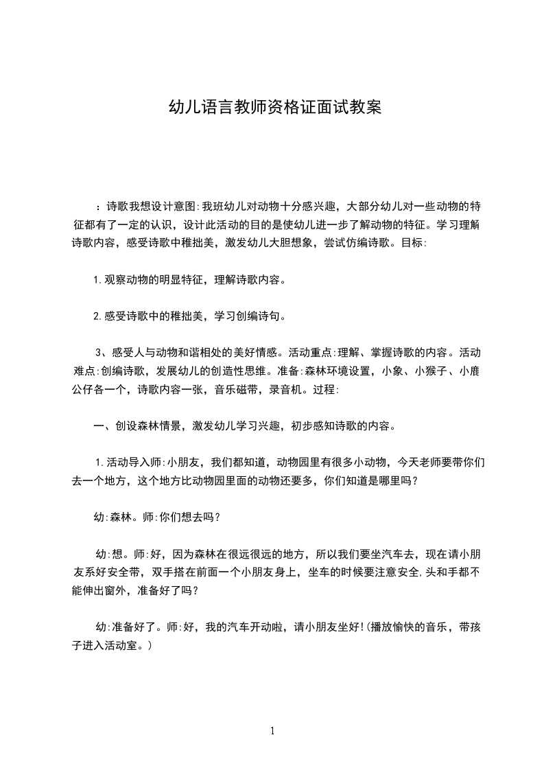 :诗歌我想设计意图:我班幼儿对动物十分感兴趣,大部分幼儿对一些动物的特征都有了一定的认识,设计此活动的目的是使幼儿进一步了解动物的特征。学习理解诗歌内容,感受诗歌中稚拙美,激发幼儿大胆想象,尝试仿编诗歌。目标:
