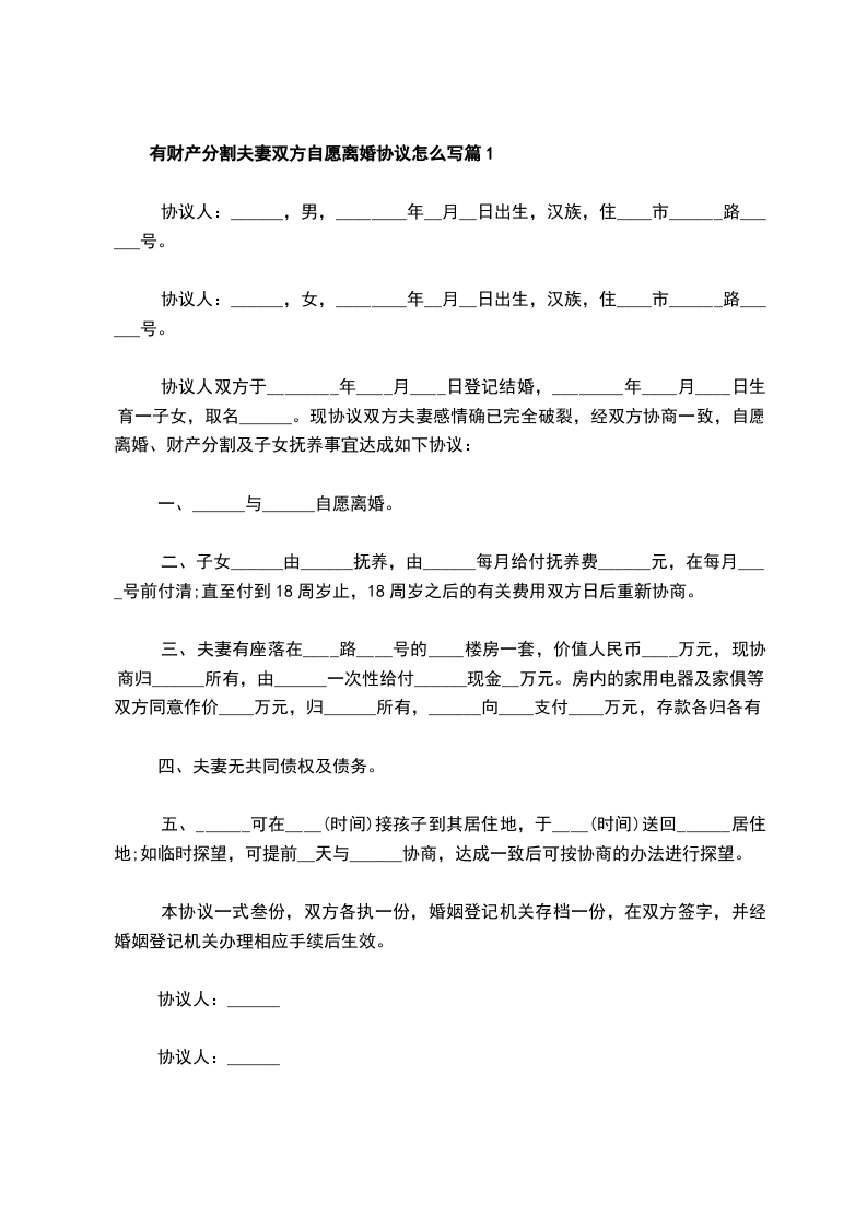 有财产分割夫妻双方自愿离婚协议怎么写篇12