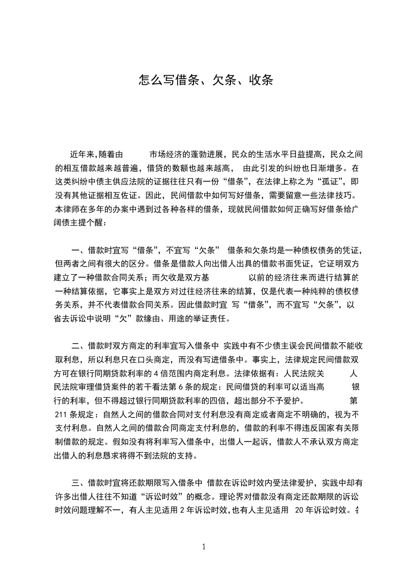 近年来,随着由 市场经济的蓬勃进展,民众的生活水平日益提高,民众之间的相互借款越来越普遍,借贷的数额也越来越高, 由此引发的纠纷也日渐增多。在这类纠纷中债主供应法院的证据往往只有一份“借条”,在法律上称之为“孤证”,即没有其他证据相互佐证。因此,民间借款中如何写好借条,需要留意一些法律技巧。本律师在多年的办案中遇到过各种各样的借条,现就民间借款如何正确写好借条给广阔债主提个醒: