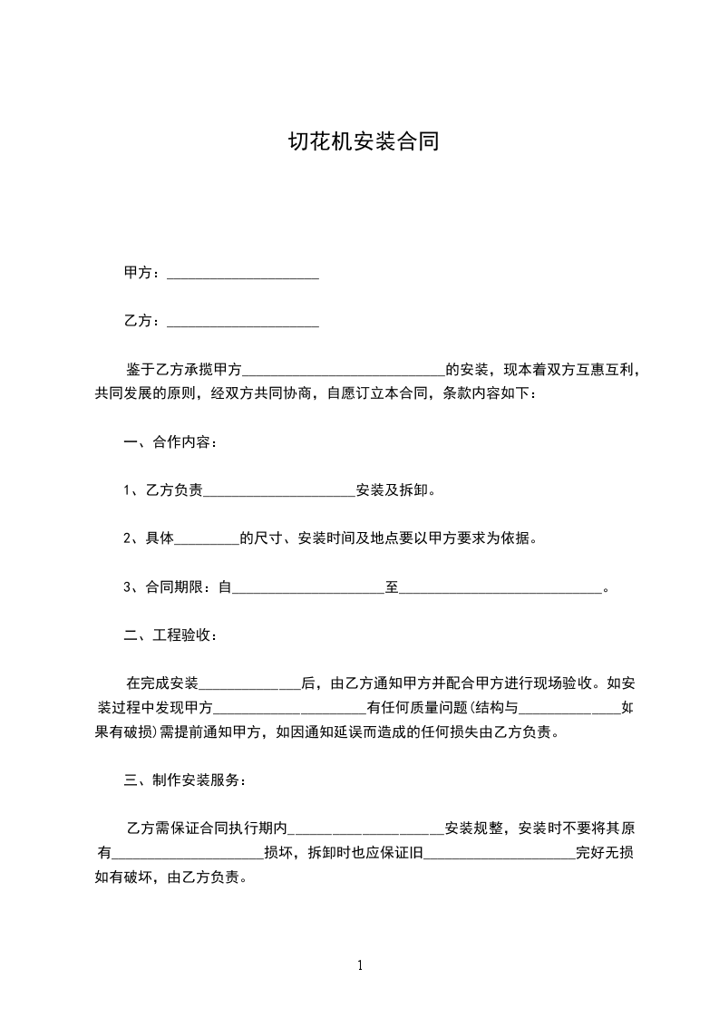 鉴于乙方承揽甲方____________________________的安装,现本着双方互惠互利,共同发展的原则,经双方共同协商,自愿订立本合同,条款内容如下: