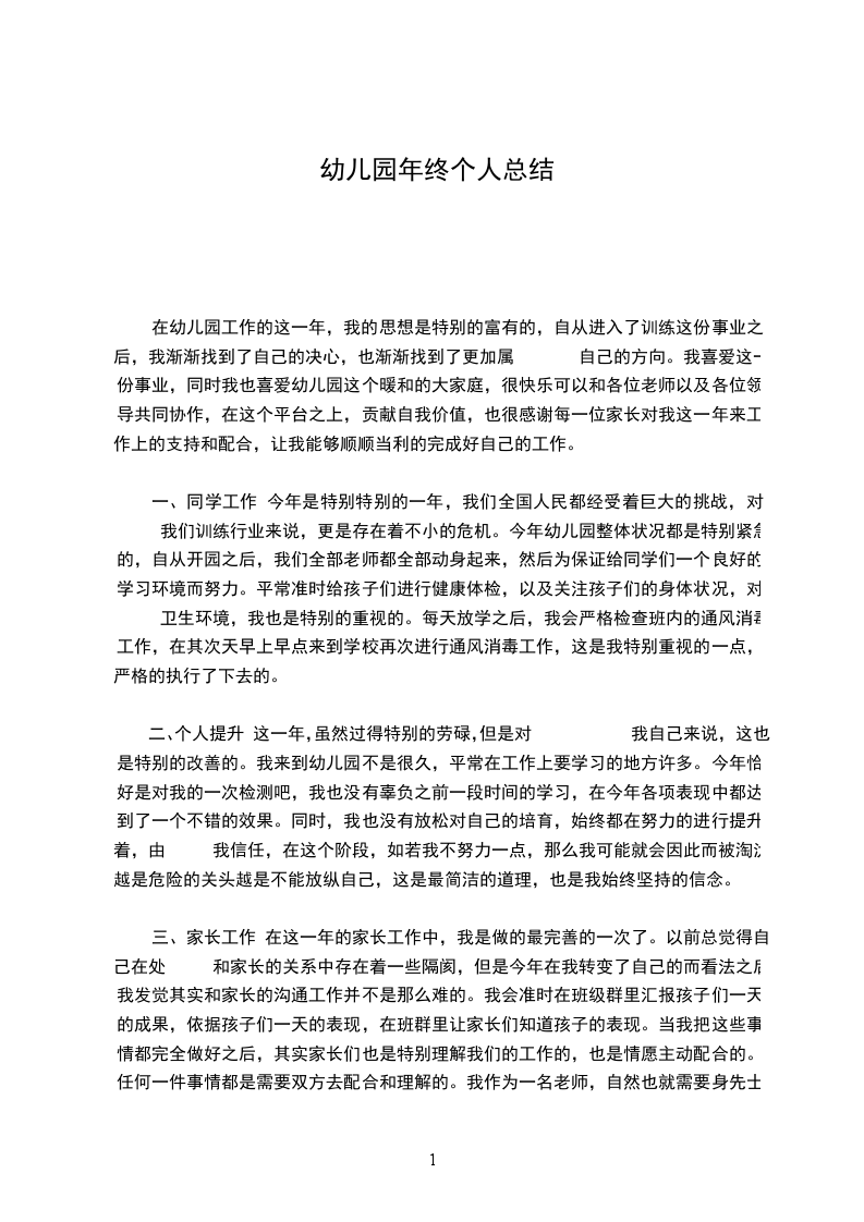 一、同学工作 今年是特别特别的一年,我们全国人民都经受着巨大的挑战,对 我们训练行业来说,更是存在着不小的危机。今年幼儿园整体状况都是特别紧急的,自从开园之后,我们全部老师都全部动身起来,然后为保证给同学们一个良好的学习环境而努力。平常准时给孩子们进行健康体检,以及关注孩子们的身体状况,对 卫生环境,我也是特别的重视的。每天放学之后,我会严格检查班内的通风消毒工作,在其次天早上早点来到学校再次进行通风消毒工作,这是我特别重视的一点,严格的执行了下去的。