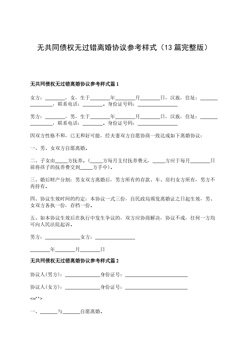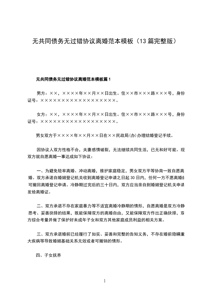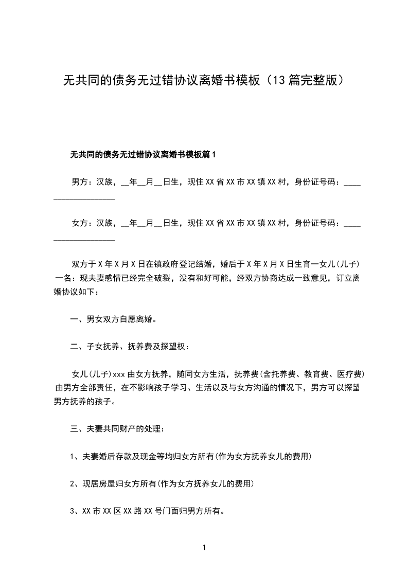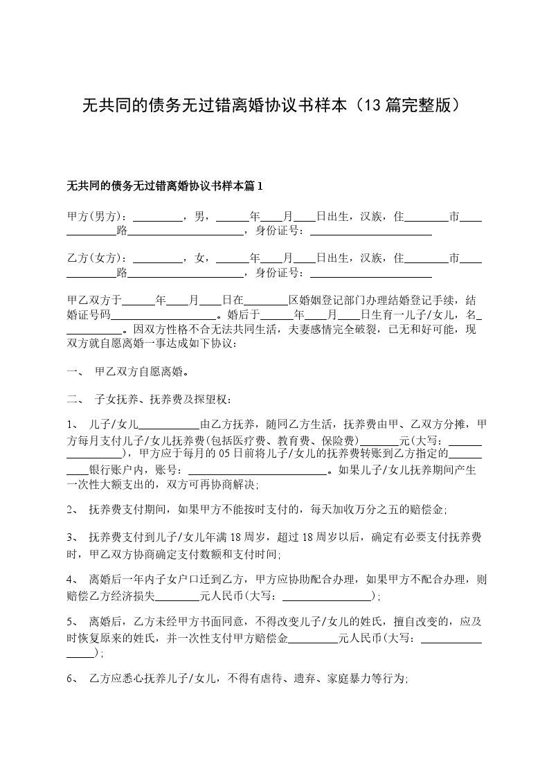 无共同债务无过错离婚协议书怎么写篇13