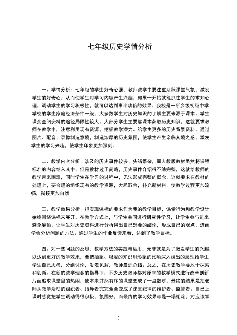 一、学情分析:七年级的学生好奇心强,教师教学中要注重活跃课堂气氛,激发学生的好奇心,从而使学生对学习内容产生兴趣,如果一开始就能抓住学生的求知心理,调动学生的学习积极性,就可以达到事半功倍的效果。我校是一所乡级初级中学,学校的学生家庭经济条件一般,大多数学生对历史知识的了解主要来源于课本。学生课余查阅资料的途径局限性较大。大部分学生主要靠课本获取历史知识,这就要求教师在教学中,注意利用现有资源,挖掘教学潜力。给学生更多的历史背景资料,通过图片、配音、录像制造意境,制造浓厚的历史氛围,使学生产生亲临其境之感,激发学生的学习兴趣,使学生印象更加深刻。