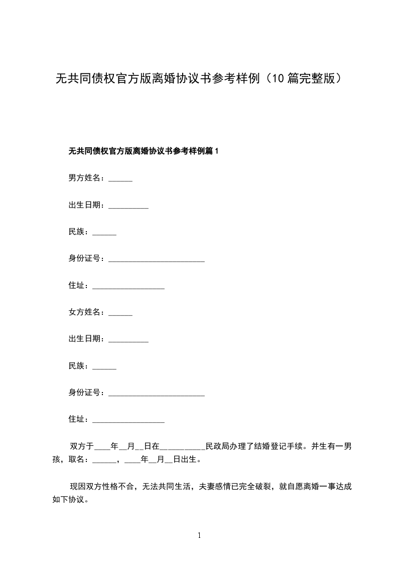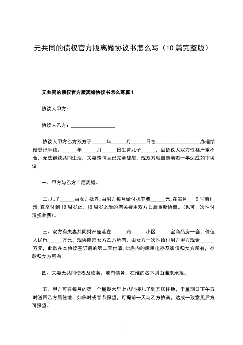 无共同债权债务官方版离婚协议格式篇10
