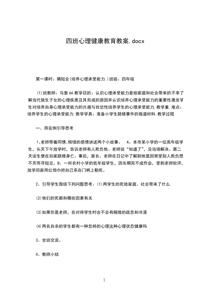 五、德育渗透虽然心理健康教育是德育渗透的重要途径,但德育不能“喧宾夺主”,削弱甚至代替心理健康教育的地位。心理健康教育有着自己特定的目标、内容和方法等,其主要任务还是在于优化学生的心理素质,培养学生健全的人格。因此,在心理健康教育中要切忌“德育化”倾向,避免将心理健康教育变成直接的道德教学,失去间接德育渗透的优势。同时,也不能把某些心理问题“道德化”,只有理清了二者之间的关系,明确各自的目标和任务,才能确保德育在心理健康教育中的有效实施,凸显德育渗透的效果。第一课我的个性教学目标知识与技能:指导学生通过他人的反馈和评价增进对自我的了解。过程与方法:培养学生的观察力和善于发现问题的能力。情感态度与价值观;帮助学生了解每个人都有自己的个性。教学重难点:学生客观的了解自己、接纳自己、肯定自己。教学过程: