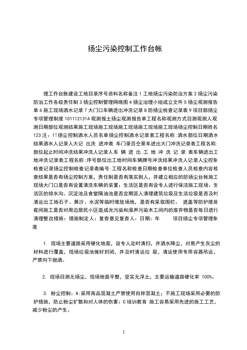 理工作台账建设工地目录序号资料名称备注1工地扬尘污染防治方案2扬尘污染防治工作各级责任制3扬尘控制管理网络图4扬尘治理小组成立文件5扬尘观测报告单6施工现场洒水记录7大门口车辆进出冲洗记录8防扬尘检查记录表9项目部扬尘专项管理制度1011121314观测报土扬尘观测报告单工程名称观测方式目测观测人观测日期部位观测结果施工现场施工现场施工现场施工现场施工现场扬尘控制日期姓名123注:1!扬尘控制洒水人员名单扬尘控制洒水记录表工程名称:洒水部位日期洒水结果洒水人记录人大记 出洗 进冲表 车门录百仝泵车进出大门冲洗记录表工程名称:部位起止时间冲洗结果冲洗人记录人车 辆 进 出 工 地 冲 洗 记 录 表车辆进出工地冲洗记录表工程名称:序号部位出工地时间车辆牌号冲洗结果冲洗人记录人尘控制检查记录扬尘控制检查记录表编号:工程名称检查日期检查单位检查人员检查内容检查结果是否有扬尘控制方案,责任制是否有落实到人,并建立相应的防扬尘台帐施工现场大门口是否有设置清洗车辆的装置;生活区是否有设专人进行保洁施工现场、生活区的排水沟、沉淀池及食堂隔油池是否定期派人清理建筑垃圾及生活垃圾是否及时清运出工地石子、黄沙、水泥等临时堆放场地,是否有采取围栏、 遮盖等防护措施夜间施工是否对周边居民小区造成光污染和澡声污染木工间内的废弃物是否每日进行清理整改措施:措施制定人:复杳意见复杳人:日期:年 项目扬尘专项管理制度
