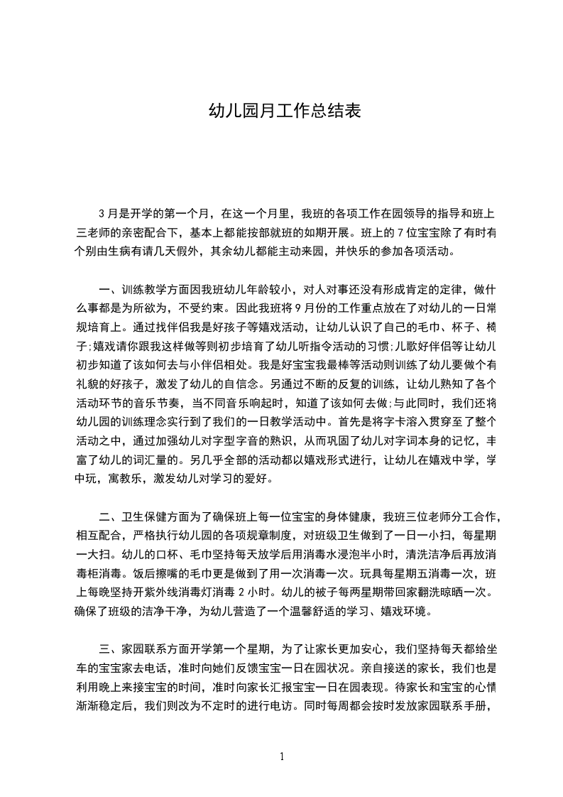 三、家园联系方面开学第一个星期,为了让家长更加安心,我们坚持每天都给坐车的宝宝家去电话,准时向她们反馈宝宝一日在园状况。亲自接送的家长,我们也是利用晚上来接宝宝的时间,准时向家长汇报宝宝一日在园表现。待家长和宝宝的心情渐渐稳定后,我们则改为不定时的进行电访。同时每周都会按时发放家园联系手册,反馈宝宝一周在园表现。如当天宝宝在园有什么格外的表现,我们也会写上一张小便条放在书包带回家,便家长了解,做到真正的家园共育。在下一个月里,我班需要进一步加强的是:对宝宝的平安训练工作,从各方面提高宝宝的自我防患意识。同时也要连续加强对幼儿的常规培育。总结二:幼儿园大班三月份工作总结三月阳光明媚,春回大地。新的一学期开头了,我们一起播种新的盼望。现将本月月工作总结如下: