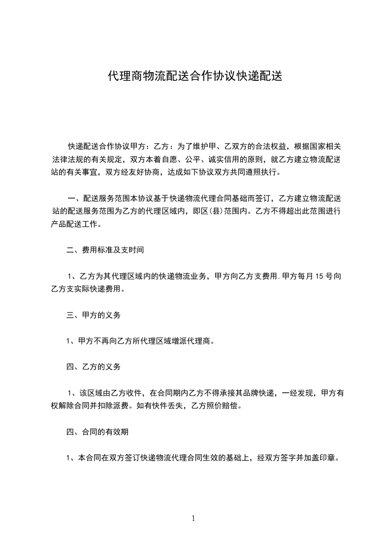快递配送合作协议甲方:乙方:为了维护甲、乙双方的合法权益,根据国家相关法律法规的有关规定,双方本着自愿、公平、诚实信用的原则,就乙方建立物流配送站的有关事宜,双方经友好协商,达成如下协议双方共同遵照执行。