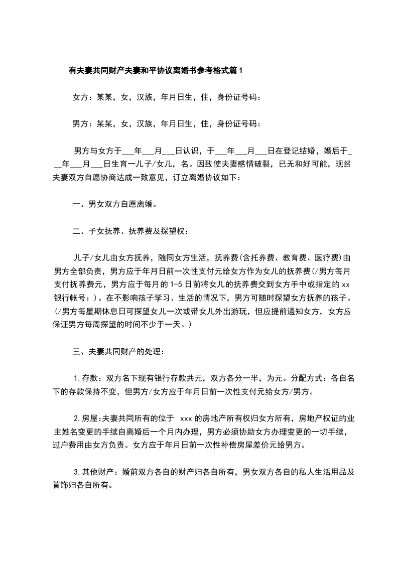 有夫妻共同财产夫妻和平协议离婚书参考格式篇2