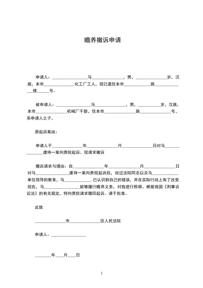 撒诉请求与理由:自_______________年_______________月_______________日对马________________虐待一案向贵院起诉后,经过法院同志以及马_____________单位领导的教育,马_____________.已认识到自己的错误,并在实际行动上有了改变。现在,马_________________能够履行赡养义务,对我进行照顾。根据我国《刑事诉讼法》的有关规定,特向贵院请求撒回起诉。请于批准。