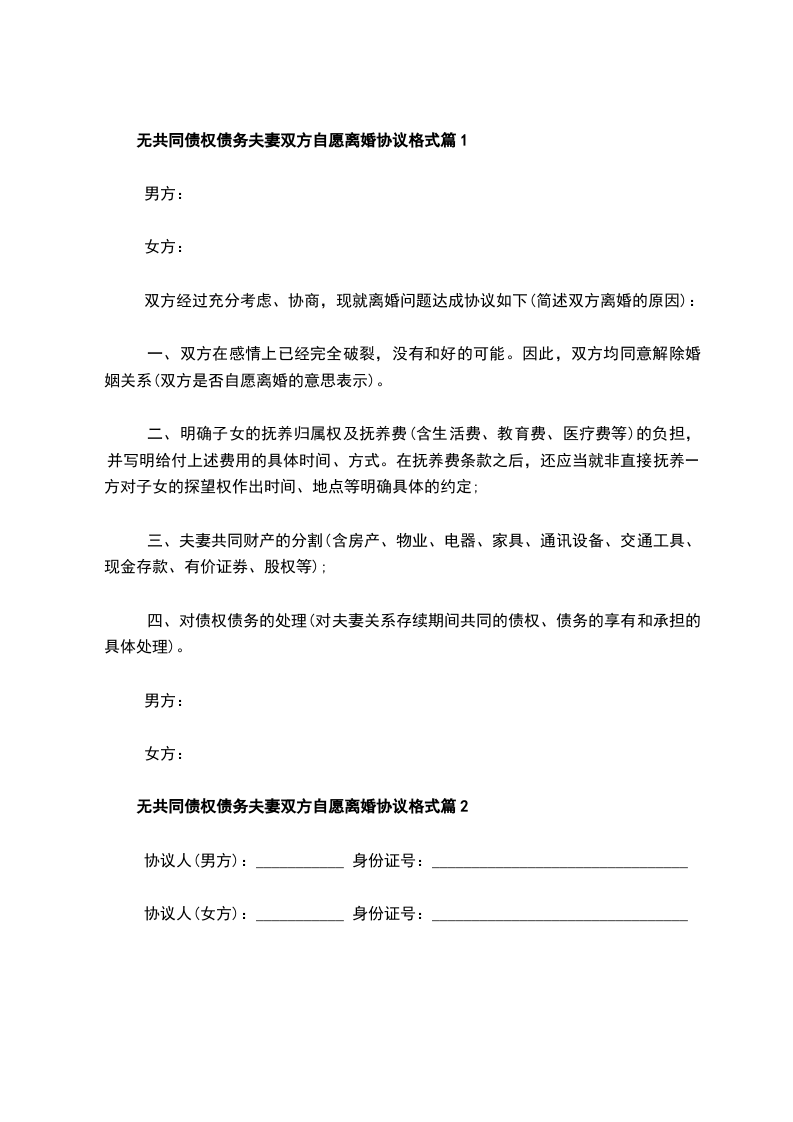 无共同的债权双方协商离婚协议参考样例篇2