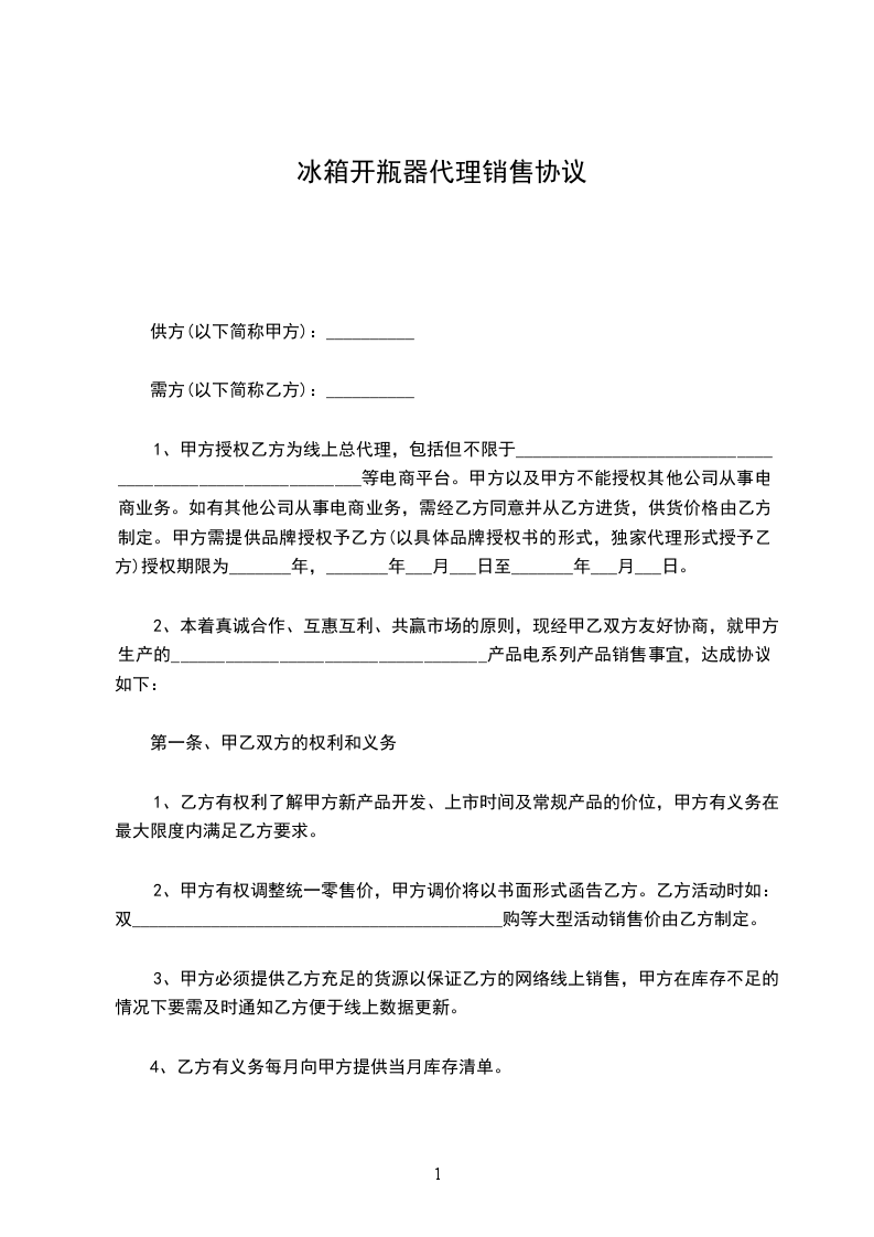 2、本着真诚合作、互惠互利、共赢市场的原则,现经甲乙双方友好协商,就甲方生产的___________________________________产品电系列产品销售事宜,达成协议如下: